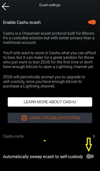 - Se você quiser resgatar os tokens ecash diretamente no canal LN de autocustódia, vá para Configurações - Ecash e ative a opção "transferir ecash automaticamente para autocustódia". Isso converterá instantaneamente todos os tokens que você receber através do seu endereço LN para o seu canal LN.