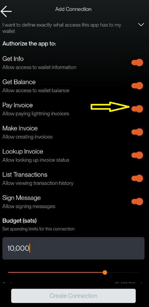 Agora que a conexão NWC foi criada, volte para editá-la (há um pequeno ícone no canto superior) e ative a opção "pagar faturas". Defina o limite do orçamento de acordo.