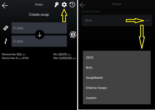 E pronto! Esse é o processo, você pode repeti-lo quantas vezes quiser. Lembre-se de trocar para on-chain a partir de seus canais LN completos, quando necessário. Você pode usar os serviços de troca integrados do Zeus. Lembrete: você pode alternar entre vários provedores de swap nas configurações de swap: