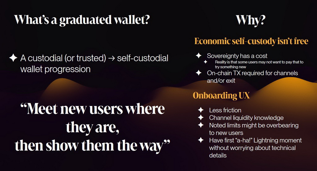 Dakle, što je "graduirani novčanik"? Kao što je Evan Kaloudis predstavio na BTC++ konferenciji (pogledajte cijeli video ispod), to je novčanik s kojim počinjete od dna i penjete se prema vrhu, polako akumulirajući satove i otvarajući kanale kada je potrebno i osjećate se ugodno napraviti sljedeći korak, sve do vrha ljestvice znanja, do najviše razine kada pokrećete moćan udaljeni čvor kojim se upravlja iz Zeusa.